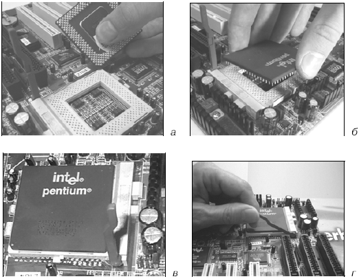 Рис. 1.17. Установка процессора Intel Pentium в Soket 7: а – ищем ключ (пропущенный контакт) на процессоре и сокете; б – укладываем процессор в сокет; в – процессор уложен в сокет, но рычаг не прижимает контакты; г – зажимаем контакты, поворачивая рычаг; д – процессор правильно установлен в сокете