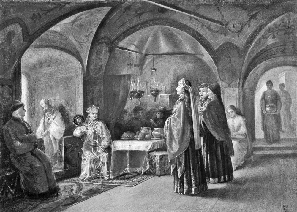 Таким образом, народ жил в постоянном страхе пред своими и чужими, не было безопасности, без которой не могут успевать ни промышленность, ни торговля, и жизнь не украшалась ни наукою, ни искусством. При этой бедности жизни были доступны человеку одни грубые удовольствия, которые не могли способствовать смягчению нравов, а только вели к усилению нескромности, которая выражалась и на деле, и в словах. Женщина для сохранения скромности должна была избегать общества, предавшегося таким удовольствиям; отсюда укоренился обычай, что жены и дочери значительных и богатых людей укрывались в теремах, не появляясь в мужских обществах, отчего мужчины еще более грубели в своих нравах, ибо не сдерживались присутствием женщины.