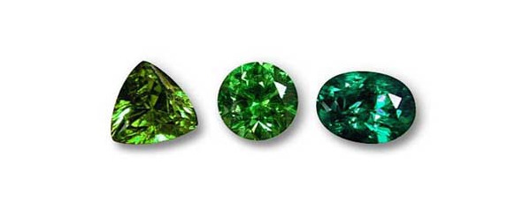 Для примера давайте обратимся к рисунку 3 с тремя зелёными камнями. На нём мы видим камни разной насыщенности: центральный камень круглой огранки – чисто зелёный, слева (огранка триллион) – желтовато-зелёный; справа, овальной формы – голубовато-зелёный.