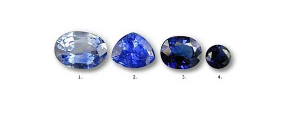 Для примера на рисунке 4 с четырьмя голубыми сапфирами: камень под номером 1 светлого тона и низкой насыщенности; камень под номером 2 близок к идеалу по тону и насыщенности; камень под номером 3 более насыщенный в некоторых областях, чем 2-ой, но в целом тон слишком тёмный и он слишком тусклый; камень под номером 4 настолько тёмного тона, что его насыщенность невысока. Заметим, что включения виднее на светлых камнях, чем на тёмных.