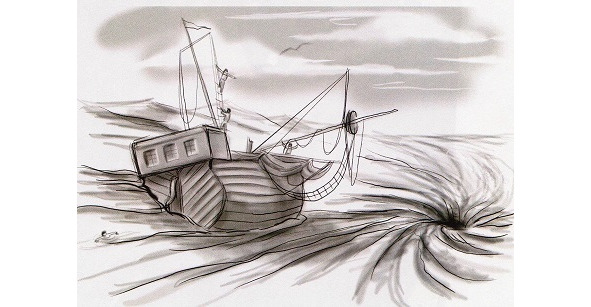 Раздался громкий треск пробитого прибрежными камнями днища. Судно вздрогнуло и село на мель. Ещё мгновение, и оно развалилось на части. Мы все оказались в воде. Мощный водоворот закрутил обломки судна и уцелевших людей, и скоро все они погрузились в пучину.