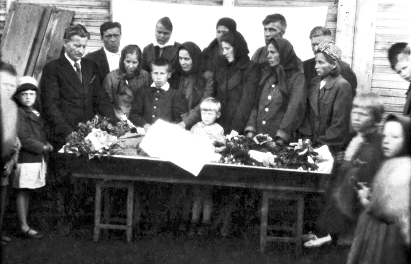 Похороны деда, 1947 год. Слева направо у гроба стоят: Геннадий Рожков, Фёдор Семёнов, мамина сестра Полина, её сын Феликс, бабушка, маленькая девочка – Лия, рядом справа от нее – Антонина, далее – соседка Катя, следующая – Тася Шутова. За спиной Кати стоит муж Полины – Виталий