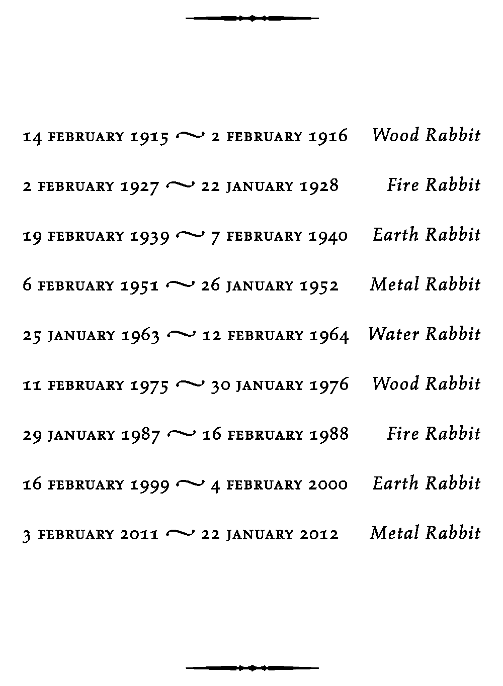The Rabbit is usually lucky in life and often has the happy knack of being in the right place at the right time. He is talented and quick-witted, but he does sometimes put pleasure before work and wherever possible will opt for the easy life. He can at times be a little reserved and suspicious of the motives of others, but generally will lead a long and contented life and one which – as far as possible – will be free of strife and discord.