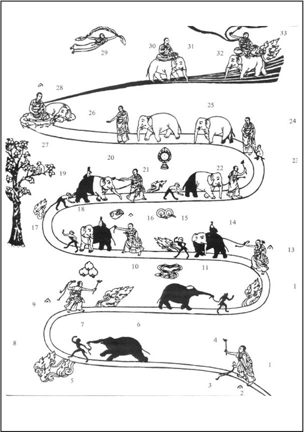 15. То, что слон оглядывается, означает, что, после отвлечения, ум вновь возвращается к объекту сосредоточения.