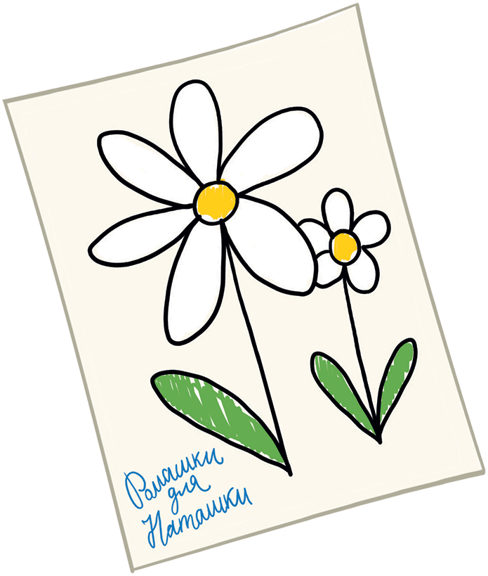 В конце концов, махнув на всё рукой, решил соорудить чего попроще. Нарисовал круглую серединку, приделал к ней пять лепестков, раскрасил и понял, что получилась ромашка. И вдруг, просияв, быстро вывел внизу листа печатными буквами: «Ромашки для Наташки».