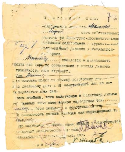 Через короткое время Маленков – уже учитель при культурно-просветительном отделении Политотдела 3-й Туркестанской кавалерийской дивизии 1-й Революционной армии. Об этом свидетельствует сохранившееся удостоверение, из которого мы узнаем, что в обязанность ему вменялось «принять все меры по организации в частях дивизии грамотности всех ступеней». Молодой «учитель» получил право подбирать себе помощников из числа «местных педагогических сил» и из состава полка по своему усмотрению. Все сельские и волостные власти обязывались обеспечивать его передвижение, предоставляя для этого подводы. В январе 1920 года его приняли кандидатом в члены РКП(б), а 10 апреля он стал ее полноправным членом. Учителем красных бойцов Георгий пробудет около года. 29 сентября 1920-го он получит удостоверение, которое ему выдаст Политический отдел 1-й бригады все той же 3-й Туркестанской кавалерийской дивизии, о том, что теперь он – инструктор-организатор организационно-агитационного отделения Политотдела. Как видим, важность идеологической мотивации и мобилизации военнослужащих на выполнение поставленных задач большевики поняли очень рано. Именно поэтому уже в годы Гражданской войны в Красной армии будет действовать разветвленный пропагандистский аппарат, активным и успешным представителем которого и стал Маленков. На него возложили руководство политической работой: устройство митингов, собеседований, чтение лекций, инструктирование и организацию партийных коллективов, контроль за работой агитаторов и их инструктирование и даже организацию ревкомов в местностях, освобождаемых «от белых басмаческих банд». Перечень прав и обязанностей, возложенных на молодого беспартийного бойца, не может не впечатлить. Ясно, что он зарекомендовал себя с наилучшей стороны – и с идеологической, и с организаторской точки зрения. Изменения коснутся не только содержания его работы и статуса, но и способа передвижения – оказывать ему содействие в передвижениях теперь обяжут железнодорожное начальство. Надолго на уровне кавдивизии Маленков не задержится. Уже в январе 1921 года он стал инструктором Политуправления Реввоенсовета всего Туркестанского фронта. Как будет вспоминать впоследствии сам Маленков, последние месяцы своей военной биографии он проведет «в агитпоезде Политуправления Туркфронта». В это время ему придется поработать и редактором газеты «Красный путь».