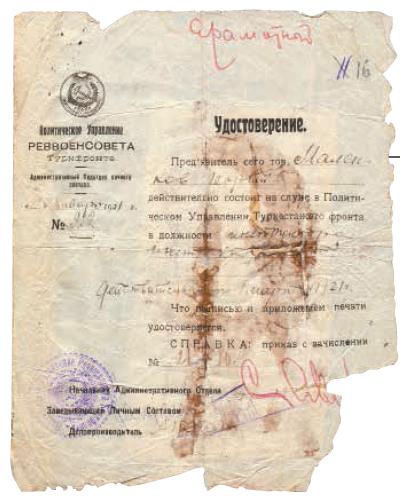 Удостоверение, выданное Политуправлением Реввоеннсовета Туркестанского фронта Г.М. Маленкову в том, что он является инструктором Инструкторского отдела. 31 января 1921 [РГАСПИ. Ф. 83. Оп.1.Д. 39. Л. 16]
