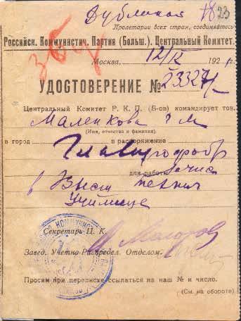 Удостоверение, выданное Учетно-распределительным отделом ЦК РКП(б) Г.М. Маленкову, о командировании его в распоряжение Главного управления профессионального образования и зачислении в [Московское] Высшее техническое училище. 12 сентября 1921