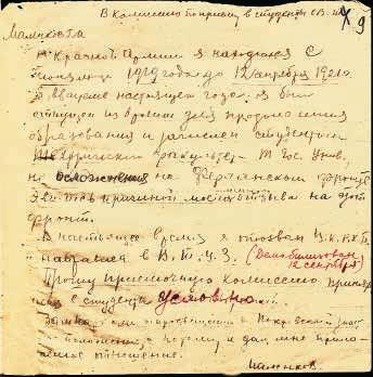 Заявление Г.М. Маленкова в Комиссию по приему во ВТУЗ (Московское высшее техническое учебное заведение, ныне МВТУ им. Баумана) о службе в армии на Туркестанском фронте и о демобилизации, с просьбой принять его в студенты условно. Не ранее 12 сентября 1921