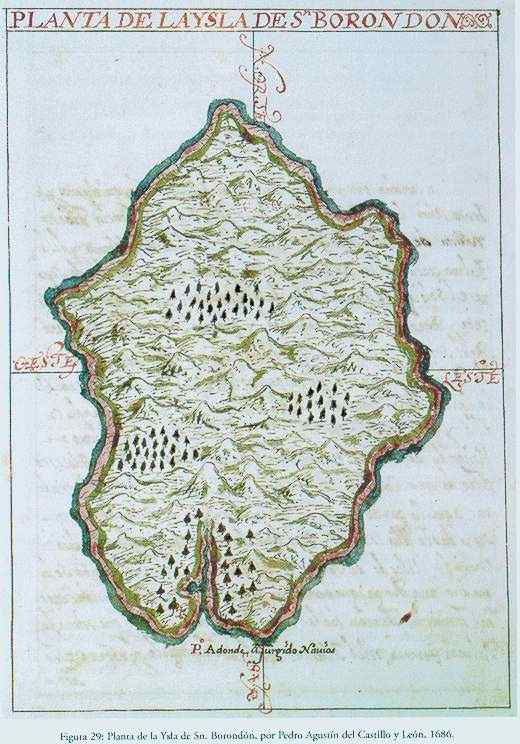 Карта острова Сан Борондон, сделанная Педро Агустином дель Кастильо и Леон в 1686 г.