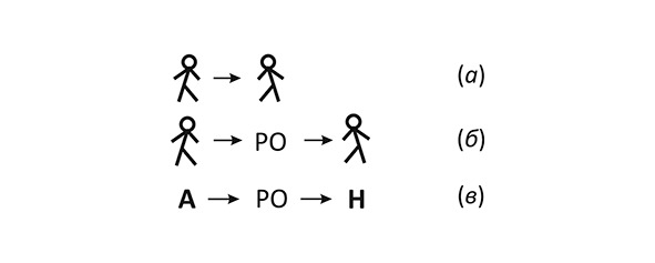 В силу сказанного, рис. 2.1 (а) следует дополнить рабочим органом. А если обозначить танцора как автора (А), а наблюдателя – литерой Н, то получим рис. 2.1 (в).