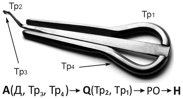 Все простейшие музыкальный инструменты представляют собой одну или несколько трансмиссий, преобразующих поступающую от человека механическую энергию, в необходимую для структурированного звука (РО) форму – акустические колебания, характерные для того или иного инструмента. Например, такой простой объект техники как варган25 (рис. 2.3) состоит из двух трансмиссий и одного рабочего органа. Одна трансмиссия (Тр1) механически удерживает объект техники в руках исполнителя и удерживает вторую трансмиссию (Тр2) – колеблющийся в проёме рамки язычок. Язычок приводится в движение пальцем исполнителя. Палец – тоже трансмиссия (Тр3) для передачи механической энергии, но она принадлежит человеку, как принадлежит ему и двигатель (Д), и право решать (ОУ), с какой интенсивностью и как часто подавать энергию от Д к Тр3. Кроме того, поскольку рамку (Тр1) при игре следует зажимать во рту меж зубов, то этот элемент тоже является Тр4, принадлежащей человеку.