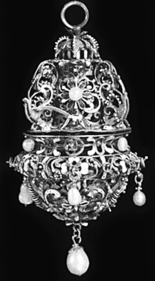 Следует заметить, что женские ювелирные украшения того времени, соответствуя особенностям одежды, были весьма своеобразны и даже носили иные названия. У знатной дамы шиньон охватывал украшенный жемчугом и драгоценными камнями ободок, шею туго облегало «каркане» – короткое ожерелье, по краю корсажа укладывалась цепь, так называемый «котуар», на плечах же возле проймы рукавов размещалось колье, которое закреплялось на середине бюста, в этом же месте фиксировалась и подвеска. В качестве примера можно привести портрет Елизаветы Австрийской, жены французского короля Карла IХ (художник школы знаменитого мастера кисти Клуэ). Все эти названия отмирали по мере того, как выходили из употребления данные виды ювелирных украшений. Давно канули в прошлое и так называемые «помандеры» (по-французски это означало «мускусное яблоко»). Они представляли собой ажурные яйцевидные сосуды из драгоценных металлов, украшенных камнями и жемчугом, в которые закладывались ароматические вещества: гвоздика, корица, мускатный орех или кусочки амбры. Эти произведения ювелирного искусства подвешивались к поясу, дабы источаемый ими аромат заглушал неприятный запах от не знавших ни мыла, ни мочалки придворных и самих монархов. Известно, что Мария Медичи (которая сочеталась браком в родной Флоренции с французским королем Генрихом IV по доверенности с его представителем) по прибытии в новое отечество упала в обморок при первой встрече с мужем из-за исходившего от него ужасного запаха (новобрачный к тому же имел обыкновение сдабривать свои кушанья изрядным количеством чеснока). Мода на помандеры была чрезвычайно распространена, во всяком случае, в инвентарной описи драгоценностей короны Франции 1500 года их числится 54 штуки.