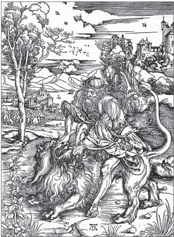 На рисунке Джованни Беллини, к творчеству которого Дюрер обращался в начале своего художественного становления, изображена женщина, держащая за пасть льва, и настроение этого сюжета скорее игривое. В нём прослеживается явная аналогия с другим полотном мастера «Мадонна с младенцем».