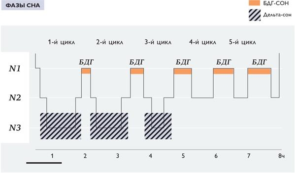 Во время сна (как правило, 7–8 часов для взрослого) спящий переходит от первой фазы ко второй и к третьей, а затем обратно ко второй. После этого спящий либо просыпается, либо переходит прямо к БДГ-сну. С этого момента цикл повторяется примерно 4–5 раз.