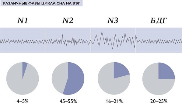 Сон делится на две чередующиеся фазы: медленный и БДГ-сон (от БДГ – «быстрые движения глаз»). Эти фазы отличаются друг от друга на электроэнцефалограмме. Большую часть времени сна занимает медленный (ортодоксальный, медленноволновой) сон, который, в свою очередь, подразделяется на три фазы не-БДГ: N1, N2 и N3. Они противопоставляются БДГ-сну, или быстрому сну – он же парадоксальный сон (REM-фаза)[15].