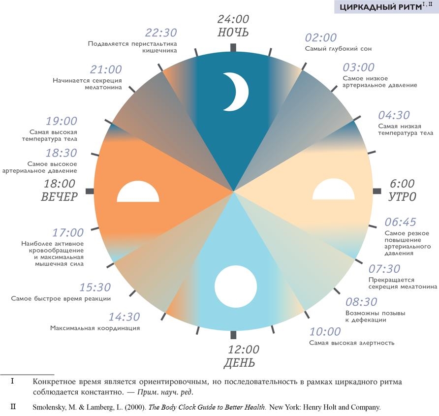 У человека есть внутренние биологические часы – их период составляет примерно 25 часов, и они ежедневно «сбрасываются», когда восходит солнце[24]. Незрячие люди вследствие своей неспособности видеть дневной свет могут испытывать проблемы со сном, однако в целом их организм, несмотря на это, прекрасно приспосабливается[25].