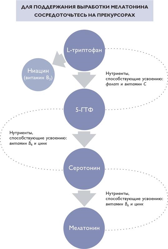 – 100–200 мг 5-ГТФ (5-гидрокситриптофана, 5-HTP) или 0,3–3 мг мелатонина за час до сна. Эффект можно усилить с помощью 50–100 мг витамина B6 и 15–30 мг цинка. Также рекомендуется принимать их соединение Zn + Mg + B6, известное как ZMA.