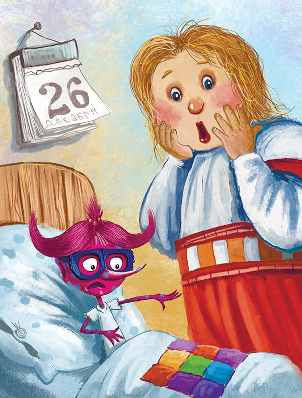 Следующим был урок рисования с художником Дрихелем, где все рисовали свои любимые ёлочные игрушки. Костик нарисовал золотую монету с дырочкой, потому что других ёлочных игрушек у него в подземелье не было. Горыша – жареную баранью ногу потому что нога мамонта на ёлку не помещается. Ёжка нарисовала своего кота Баюшу потому что он вечно ёлку с игрушками переворачивал и потому, что любила его рисовать. Василисы и Иван Царевич нарисовали блестящие зеркальные ёлочные шары, потому что они были отличниками и делали всё правильно. Иван Дурак, чтобы отличаться от отличников, нарисовал фигу (это фрукт такой, его ещё инжиром называют, а не то, что вы подумали). Емеля изобразил сдобный румяный калач: только из печи, с пылу с жару, спешит к самовару. У них в семье ёлку традиционно калачами украшали. Хаврошечка стеклянного попугая нарисовала разноцветного. Это ещё бабушкина игрушка новогодняя была. Как раз с неё размером – с бабушку. Очень Хавронье нравилась эта игрушка, а бабушку Хавроша просто обожала. Миша Леший снегиря красногрудого нарисовал, да такого живого, что тот прямо с листа слетел и давай по классу кружить. Пришлось окно открывать и выпускать птичку.