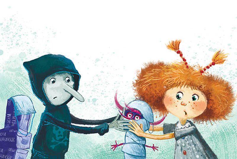 Остальная классная компания закружилась вокруг зелёного Горыши, словно возле ёлки, шумно радуясь предновогоднему развлечению. И тут Кики чихнула. Точнее, ЧИХНУЛА! Выглядело это примерно так, как если бы в лапах змея взорвалась огромная хлопушка. Это было так мощно, громко и неожиданно, что всех, включая хоровод, змея и Хаврошечку разнесло по классу как парашютики одуванчика. А посреди класса на полу осталась сидеть весьма озадаченная собственным чихом кикимора. Она попыталась что-то сказать, но снова чихнула. Уже не так громко. Но стёкла в окнах класса задребезжали, а одноклассники, лежащие на партах и полу по кругу, дружно закрыли уши в ожидании следующего взрывного чиха. И он, конечно же, не заставил себя долго ждать. А вместе с третьим чихом в класс буквально вбежали запыхавшиеся Нил Нилыч Крокодилов, медсестра Софочка и Ёжка с Костиком. Все они были в марлевых повязках на лице, а в руках держали большие коробки с медицинскими масками.