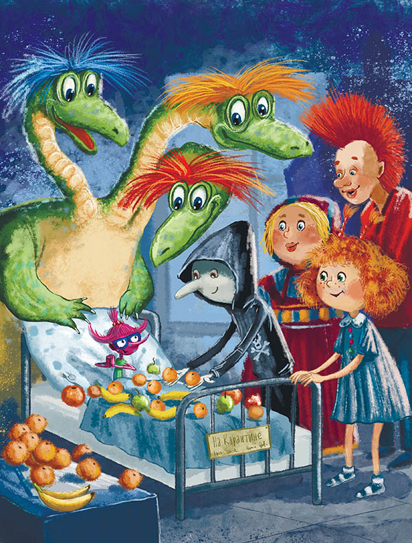 – А вот и ёжкинцы героические пришлёпали! Добро пожаловать в наш весёлый лепрозорий! Только вас и не хватало, – хриплым голосом поприветствовала их малышка Кики, на больничной кровати которой (заваленной апельсинами и бананами) восседала довольная Хавроша. А вокруг, по углам кабинета, на столе и в кресле Софочки примостились остальные сказочные ученики.