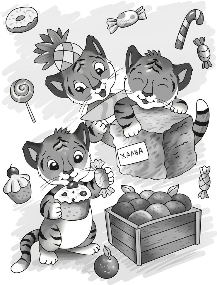 Расплескалась радуга,Мех забрызгав красками.Тигры любят патоку,Кексы с ананасами,Апельсины в ящикахИ халву с конфетами…Не мясоедящиеТигры разноцветные.