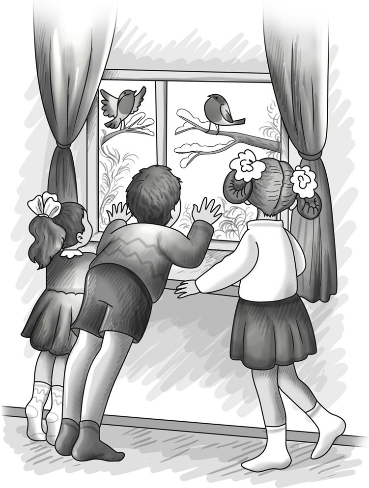 К заиндевелому окошкуПрильнули детские ладошки.Не оторвать ребячьи глазкиОт волшебства декабрьской сказки.– Посторонись чуть-чуть, Серёжка,Подвинься вправо хоть немножко.Дай постоять ещё минутку.У птички рассмотрю я грудку.С восторгом хлопали реснички.Снегирь наряднее синички.Румяно брюшко с чёрным фраком,Лоснятся перья серым лаком.В окне, за изморозью колкой,Как огоньки нарядной ёлки,Сверкало птичье оперенье.О, сколько детям наслажденья!Забыв игрушки, сласти, книжки,В окно глазели ребятишки,Любуясь небывалой птицей —Прекрасной зимнею зарницей.