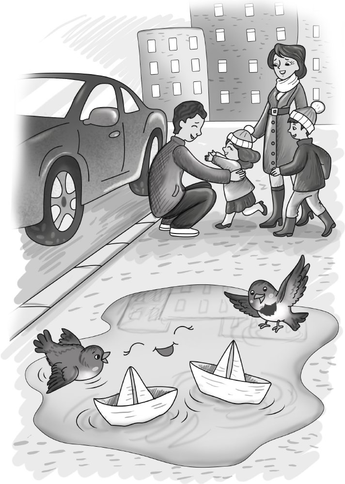 Грустная лужа лежит на дороге.В луже девчушка побулькала ноги.В ней искупалась большая собака,И воробьишки затеяли драку.Ходят по краю две серых вороны,Смотрят на лужу они удивлённо:«Что загрустила? Давай улыбайся!И поиграть с нами ты постарайся!»Лужа подумала, разволновалась,Заулыбалась и вширь расплескалась.Дети пустили кораблики в луже,И воробьям драться больше не нужно.Весело луже со всеми играться:Стали дома в ней вверх дном появляться.Сразу полнеба в себе отразила.Даже забыла она, что грустила!