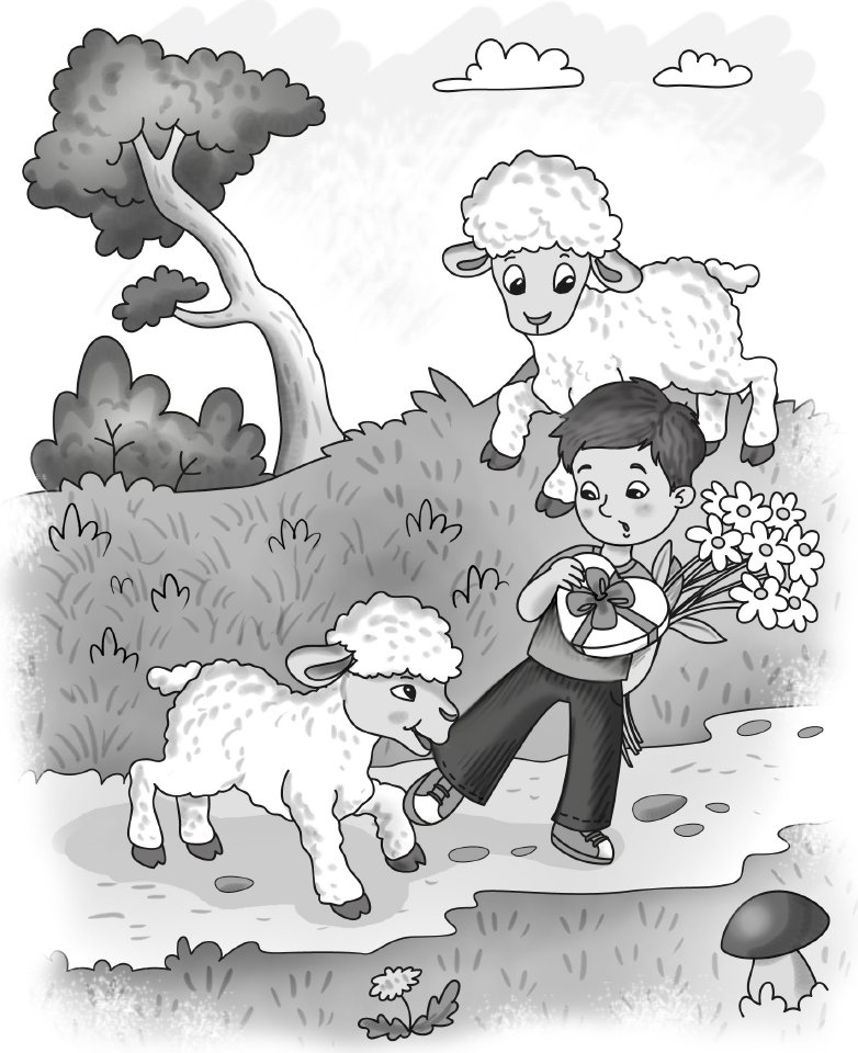 Я несу букет ромашекИ конфет коробку.А навстречу мне барашекКовыляет робко.И ещё один с пригоркаМолча наблюдаетБез малейшего восторга,Но не нападает.Я цветы свои за спинуПрячу от барашка.Он жуёт мою штанину,Белая кудряшка.Я ему сказал: «Не надоЕсть мои ромашки.Я несу сюрприз для мамы,А не вам, барашки».