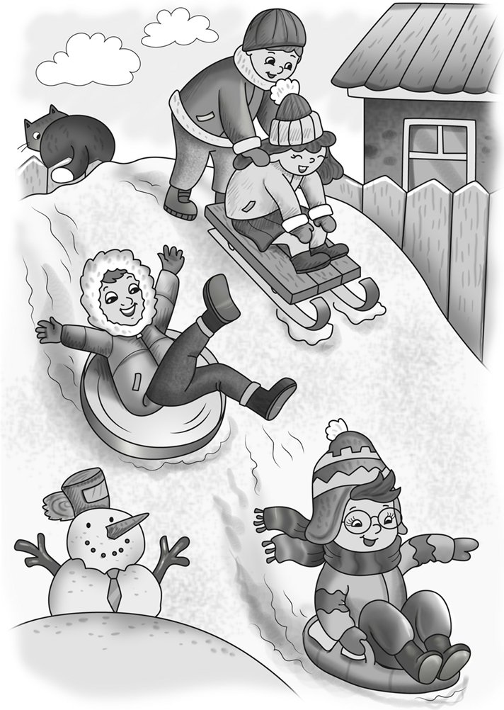 Радость, озорство, весельеСловно правят новоселье!Веселится детвора,Все кричат зиме: «Ура!»В шубки, валенки, перчатки —И на горку без оглядки.Санки мчатся что есть мочи…Звонко детвора хохочет!