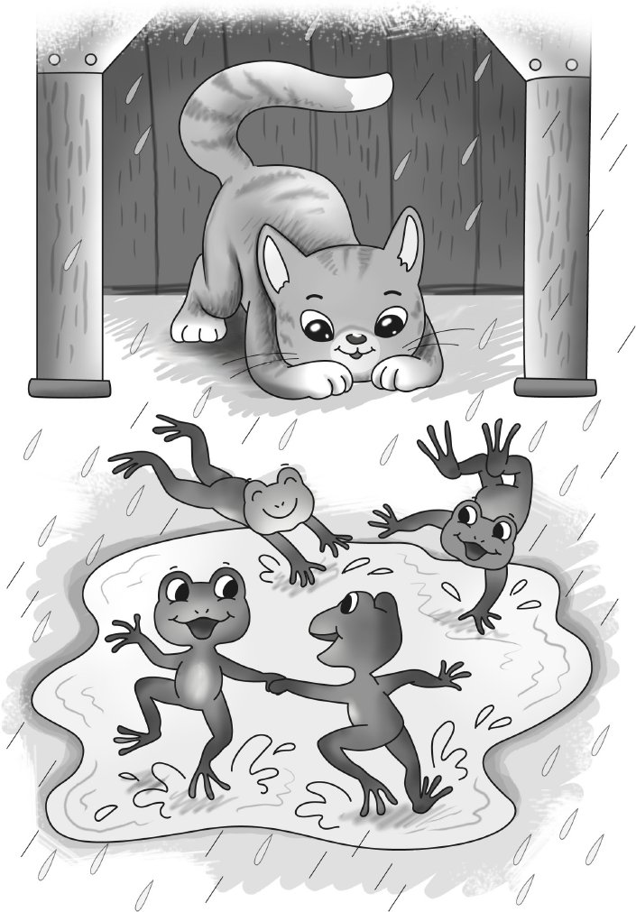 Сегодня праздник у лягушек —Льёт дождик, словно из ведра,И целый выводок квакушекОтважно скачет средь двора.А кошка смотрит с интересомНа их весёлый хоровод,От ливня прячась под навесом,Удобного момента ждёт,Чтобы внезапным нападеньемПобольше в плен квакушек взятьИ цепкой лапкой с наслажденьемЛягушкам брюшки щекотать.
