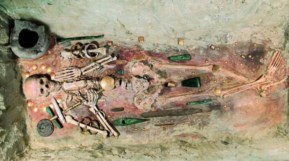 Вокруг костей были расположены 990 золотых предметов общим весом около 1,5 кг. С левой стороны тела лежал лук, от которого сегодня остались только золотые накладки. Кроме этих царских знаков, в той же могиле были обнаружены и многочисленные медные и каменные предметы – медный топор, зубило, шило, иглы, ножи из кремня и глиняный сосуд.