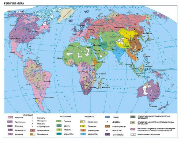 Она в какой-то приближённой перспективе показывает распределение и влияние различных конфессий. Разумеется, её точность можно совершенствовать, добавляя вкрапления новых культов. Например, на территории Китая добавить новые христианские церкви и так доработать подобные карты. Также было бы интересно взглянуть на подобные карты времён римской империи и средневековья с вымершими религиями. Благодаря средствам связи эта карта будет становится ещё пестрее.