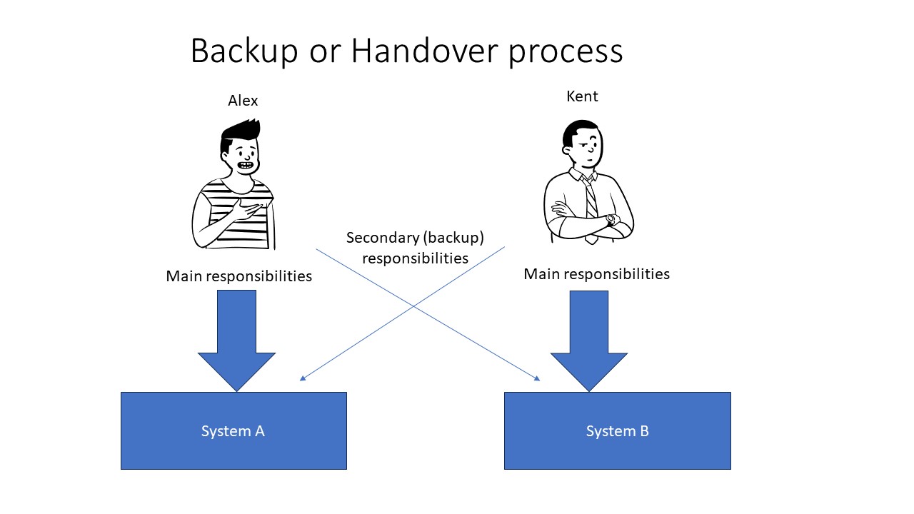 Тем не менее, для обеспечения беспрерывной работы, требуется дополнительный шаг: выделите время для Алекса и Кента, чтобы подготовить инструкции и помочь друг другу научиться управлять системой, за которую они отвечают. Как только это будет сделано, реализуйте перекрестное «резервную замену» друг друга: когда Алекс болен или находится в отпуске, Кент может отвечать за поддержку системы А, и наоборот – когда Кент недоступен по какой-либо причине, Алекс берет на себя поддержку системы Б.