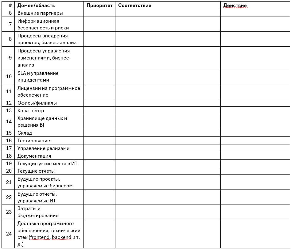 Несмотря на то, что поначалу это действие может потребовать больше времени и временно отвлечь вашу команду (а также некоторых бизнес коллег) от повседневных задач, его важность не следует недооценивать. Тщательно проработайте каждый пункт, так как это может оказаться экономией времени в будущем и поможет выявить потенциальные слабые места в вашей ИТ-области.