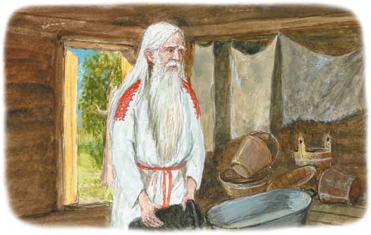 Дверь распахнулась: свет неяркий, но неожиданный, врезался в глаза. Перед Дашей стоял белый старец, дедушка по-нашему. Белая рубаха по колено, тёмные порты, седые волосы до пояса, такая же борода, а в руках валенки. Стояла Даша не в чулане, а в каком-то сарае или мастерской, увешанной серыми полотнищами. Посередине были разбросаны вёдра и корыта. Но самое странное, за спиной старца зеленели деревья: значит, снова лето?