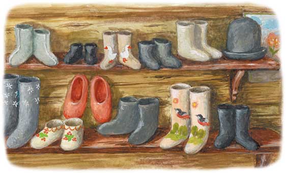 Даша ахнула. Стены были увешаны коврами, циновками (такие полотна она видела у бабушки), в углу висела странная одежда: то ли тёплый плащ, то ли пальто. А вдоль стены, на полках, красовались разные валенки: большие и маленькие, короткие и длинные, со швами и без, обычные серые и даже разноцветные, с рисунком. А рисунки были словно живые, нежные и спокойные.