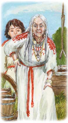 Даша рванула на улицу, оставив в полном недоумении дедушку Луку. Хлопнув дверью, она вылетела во двор. Чуть поодаль, у недавно срубленного колодца, стоял мальчик в холщовой рубахе и широких портах, выплёскивая воду из бадьи в ведро. А помогала ему старушка, при взгляде на которую у Даши холодок пошёл по телу. Что-то с ней было не так.
