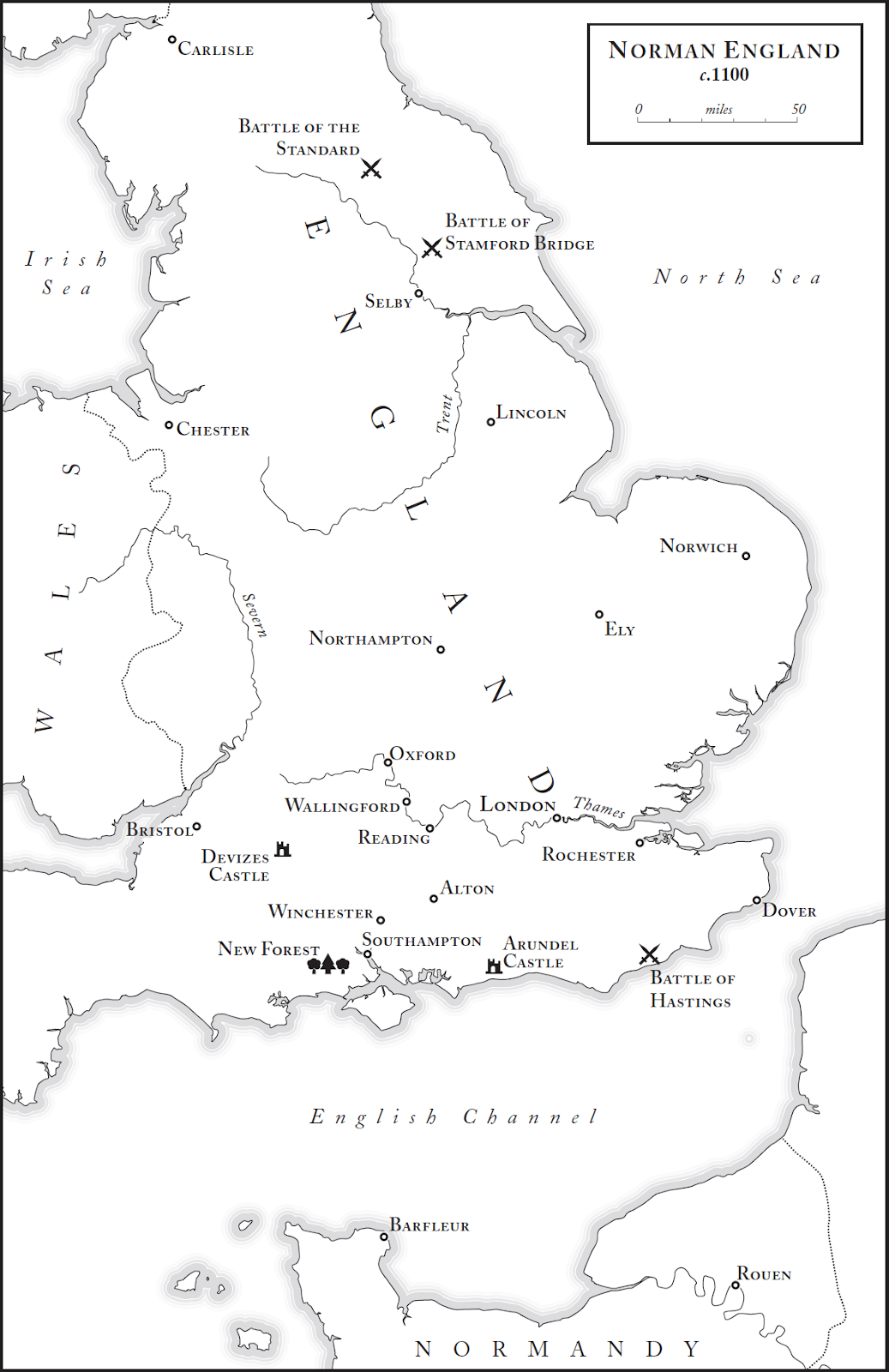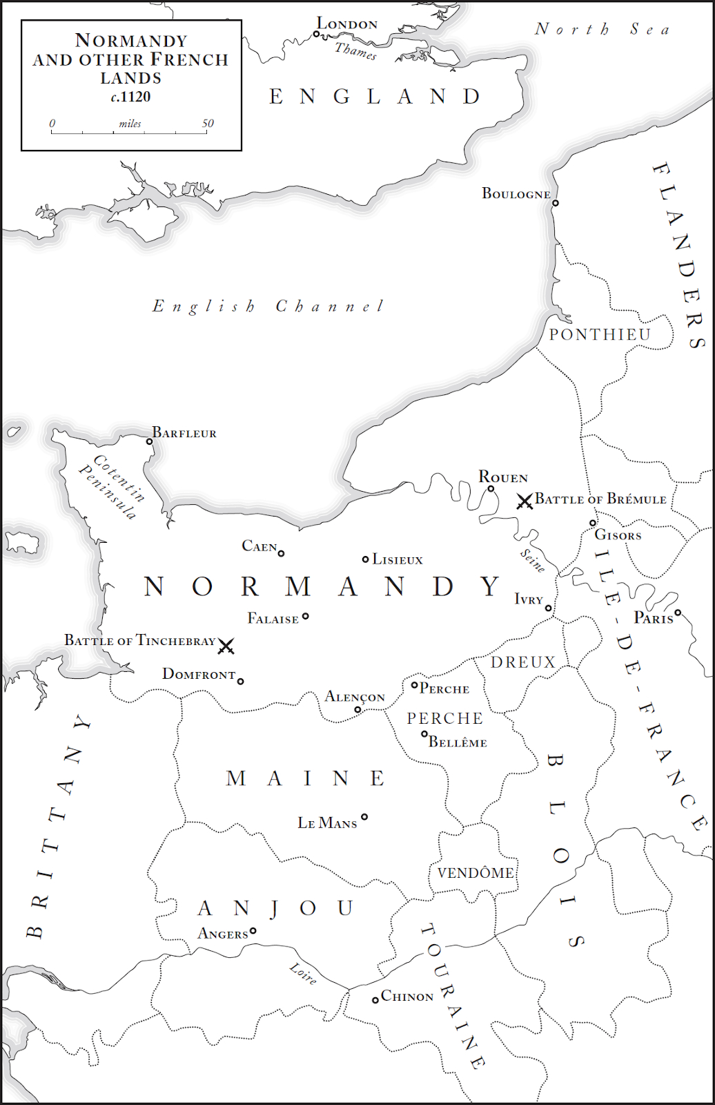 To the far west lay Brittany, a Celtic land that had seized its freedom in the ninth century and had remained self-governing ever since. To the east of Brittany sat the county of Maine, which had Anjou to its south. Maine and Anjou both extended eastwards to abut the county of Blois. Blois, in turn, bumped up against the western border of Louis VI’s axis of power. Meanwhile, when Louis looked to his north-west, he saw the imposing duchy of Normandy, whose capital, Rouen, covered a greater land area than his principal city of Paris.