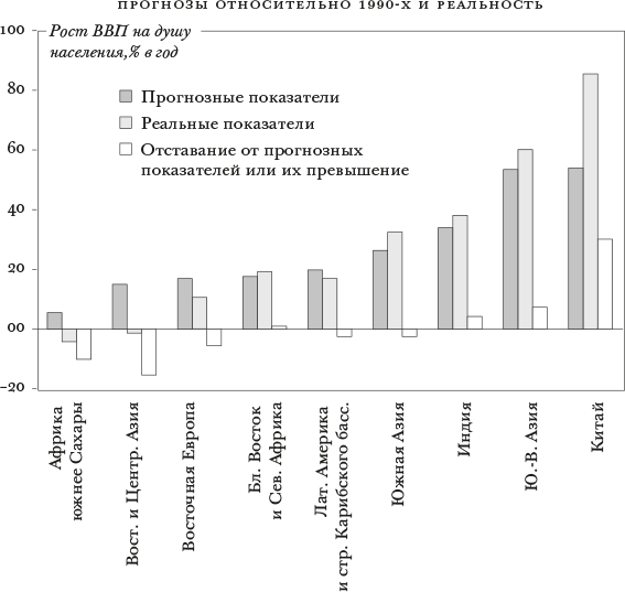 Приведенная ниже диаграмма демонстрирует прогнозы, сделанные экспертами в 1990-х годах, в сопоставлении с реальными изменениями, и разрывы между прогнозами и реальными результатами. Вообще говоря, низкая эффективность корреспондировала с низкими темпами роста (реальными и прогнозными). Для Африки это было потерянным десятилетием. Затем положение улучшилось впечатляющим образом. Для стран Восточной Европы, вышедших из холодной войны, это десятилетие также было трудным. Большая (и лучшая) часть десятилетия ушла, вероятно, на переход к рыночной экономике и соответствующей ей политике. После 2000 г. функционирование экономики этих стран улучшилось. Особенно стремительными темпами шло развитие экономики Китая. Практически никто не ожидал устойчивых темпов роста, превышающих 9 % в год. Это было чем-то доселе невиданным.