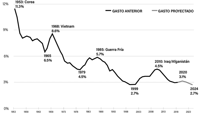 En 1992, el gasto empezó a reflejar el comienzo del “dividendo de la paz”, reduciéndose a 4,7% del PIB. Lo cierto es que el promedio de gasto de defensa desde el fin de la Guerra Fría es 3,7% del PIB; esto se refleja en un par de años cuando alcanzó su punto menor de 2,7% del PIB en 1999, 2000, y 200124. Aunque es cierto que en 2019 el gasto de defensa fue de $686 mil millones de dólares —una suma notable—, la verdad es que representa apenas el 3,2% del PIB.