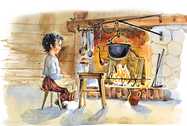 Внизу он подошёл к очагу, придвинул к себе маленький котёл, висевший на цепи, сел на деревянную треногу и раздул огонь. В котле зашумело, а под ним старик держал над огнём на длинной железной вилке большой кусок сыра, поворачивая его разными сторонами, пока он не подрумянился до золотистого цвета. Хайди смотрела с напряжённым вниманием; должно быть, ей что-то пришло в голову: она вскочила, подбежала к шкафу и засновала туда-сюда. Тут и дедушка подошёл к столу с котелком и обжаренным сыром на вилке; а на столе уже лежал каравай хлеба, стояли две тарелки с двумя ножами, всё было расставлено как следует, поскольку Хайди ещё перед этим приметила, что где находится в шкафу, и знала, что им понадобится для еды.