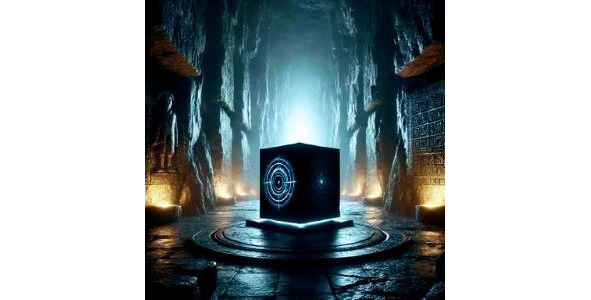 В центре залы Алексей видит массивный артефакт – чёрный монолит в форме куба, покрытый неизвестными надписями.