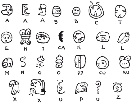Рис. 5. «Алфавит майя», записанный епископом Диего де Ландой для книги «Отчет о происходящем на Юкатане»