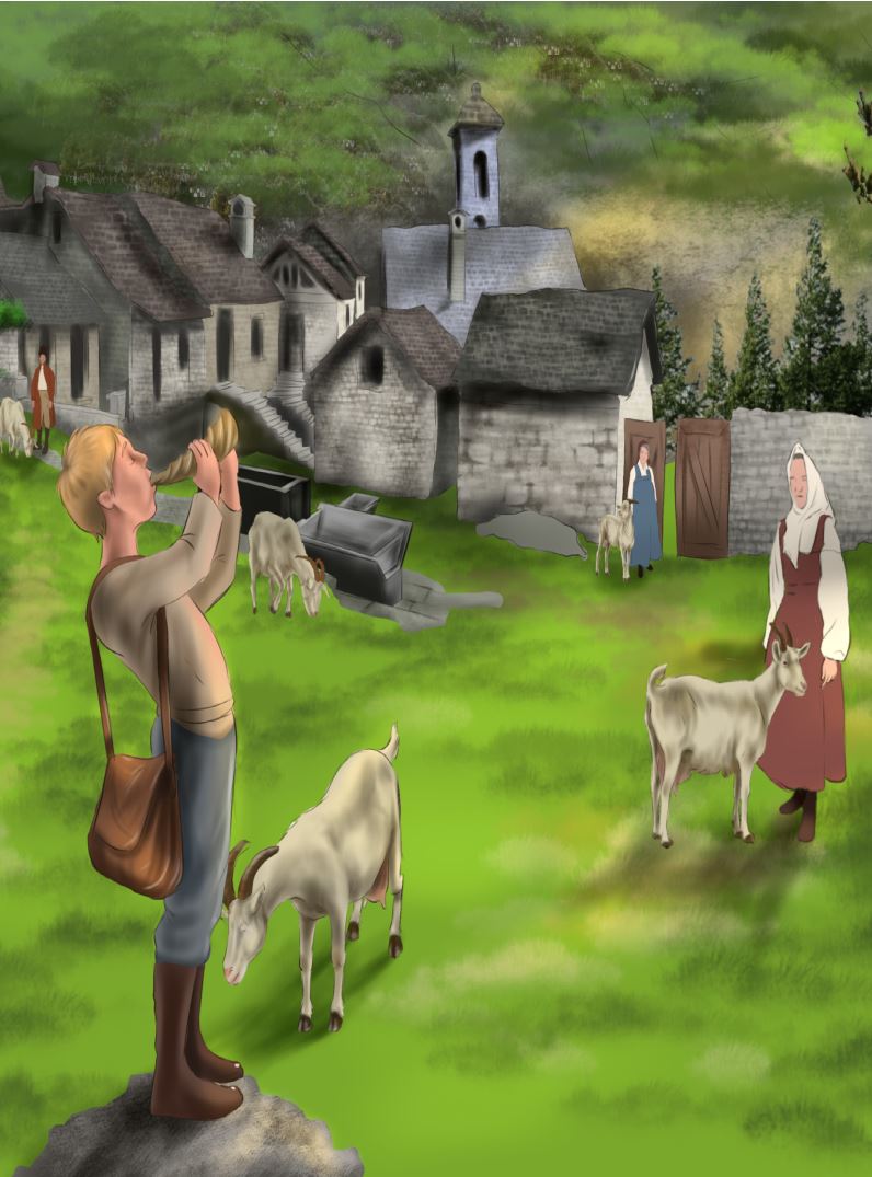 Mäggerli’yi yatırdıktan sonra hızlıca sürüsüyle önce hamamın önündeki dağı aşıp, sokağı inip köye doğru ilerledi. Boynuzunun içine, tüm köyün duyabileceği şekilde güçlü üfledi. Her avludan kendi keçisini uzaktan tanıyan ve üzerine koşan çocuklar geliyordu. Yakın evlerden ise kadınlar geliyordu. Keçilerini ya iplerinden ya da boynuzlarından tutarak götürüyorlar ve kısa zaman içinde tüm sürü dağılıyor, her hayvan yerini buluyordu. Son olarak Moni kendi keçisiyle birlikte kahverengi keçiyle yalnız kaldı ve oradan dağ yamacında bulunan evine gitti. Büyükannesi ise kapıda bekliyordu.
