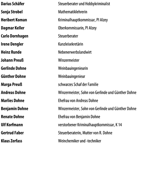 Renate Dohne ist spurlos verschwunden. Nach ihrer Ausbildung bei Darius Schäfer hat sie sich für eine Laufbahn bei der Polizei entschieden, dann aber den Polizeidienst kurz nach ihrer Hochzeit quittiert. Jetzt ist sie offenbar aus einer unglücklichen Ehe geflohen. Aber warum meldet sie sich nicht einmal bei ihrer Mutter? Hat ihr Verschwinden vielleicht doch etwas mit ihren früheren Recherchen bei der SoKo Rheinhessennetz zu tun? Hat die Vergangenheit sie eingeholt und in den Sumpf aus Wirtschaftskriminalität, Erpressung und Drogenhandel gezogen? Oder sollten Darius Schäfer und Kriminalhauptkommissar Heribert Koman doch einer ganz anderen Spur folgen? Denn schnell wird dem Steuerberater mit Spürsinn klar, dass die Winzerdynastie Preuß & Erben, in die Renate eingeheiratet hat, so manches Familiengeheimnis hütet. Gerade als Darius Schäfer meint, in einer Sackgasse zu stecken, kommt es zu einem Wiedersehen mit Renate Dohne, das er sich ganz anders vorgestellt hat …
