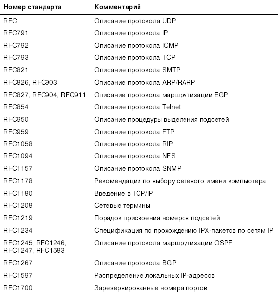 Стандарты Интернета описаны в документах, известных как RFC (Request For Comments). В табл. 3.8 приведены некоторые стандарты.