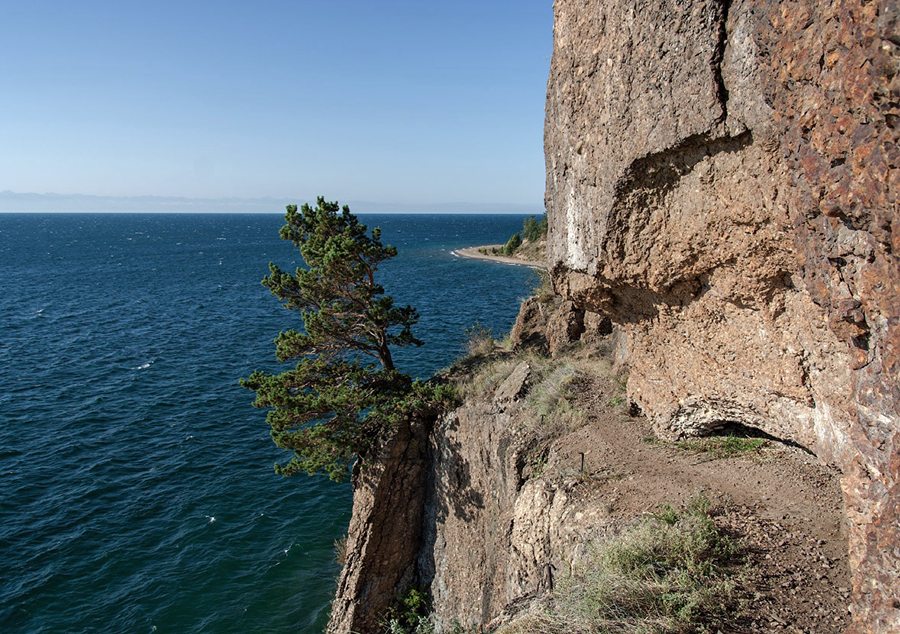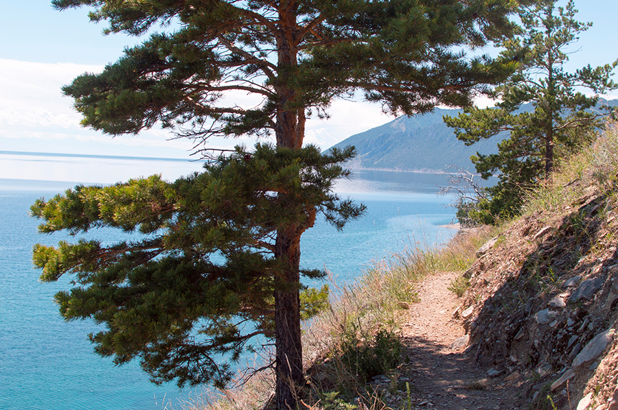 Тропа неторопливо петляла по склону, медленно забирая вверх. Кругом росло множество старых деревьев с цепкими ветвями. Местами они сковывали тропу в столь тесных объятиях, что едва можно было протиснуться, а иногда вдруг расступались, позволяя взору охватить величественный Байкальский пейзаж. Несмотря на красивое окружение, я скоро выдохся и привалил на короткую передышку. Из-за тяжелого рюкзака болели плечи, а мышцы ног забились от долгого подъема. Решено было оставить рюкзак и взобраться на вершину налегке.