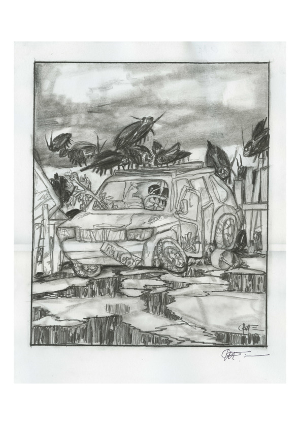 Пройдя совсем немного вперед, Марк очутился в старом поселении, вросшие, полуразрушенные домики отступали перед натиском новых коттеджей. Проходя мимо обитаемых домов, он увидел странных пауков. Они были гигантские, метра два в размере. Их внешний вид, да и вообще их появление сильно озадачили Марка. Удивление сменилось страхом. Он захотел укрыться в старом разрушенном доме неподалеку и подумать, что делать дальше. Марк искал вход в дом, но дверь была сзади. Пройдя по грязной тропинке, он разглядел в гуще некогда прекрасного сада старый автомобиль. Внутреннее желание скорей уехать отсюда превозмогло его боязнь быть пойманным в краже.