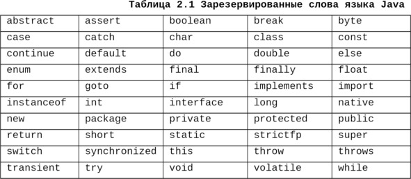 В таблице 2.1 приведены ключевые слова, зарезервированные для синтаксических конструкций языка Java. Они не могут быть именами переменных, классов и т.п., их нельзя переопределять.